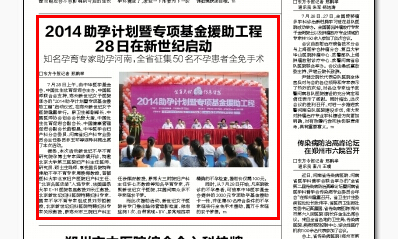 [导读]: 2014助孕计划暨专项基金援助工程28日在新世纪启动 知名孕育医生助孕河南,全省征集50名不孕患者全免手术 □东方今报记者 邢鹏举 7月28日上午,由中华医学基金会、中国优生优育促进 ...