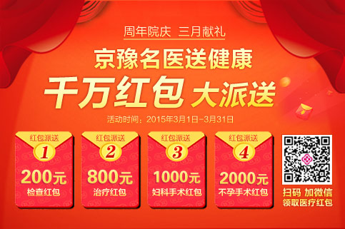 2015年3月1日-3月31日,郑州新世纪女子医院“京豫名医送健康,千万红包大派送”,届时,京豫科学医生联袂亲诊,千万医疗红包不限量派送,妇科、不孕微创手术倾情援助。关注河南女性健康,倡导健康的生活方式,提升河南女性身心健康质量。
