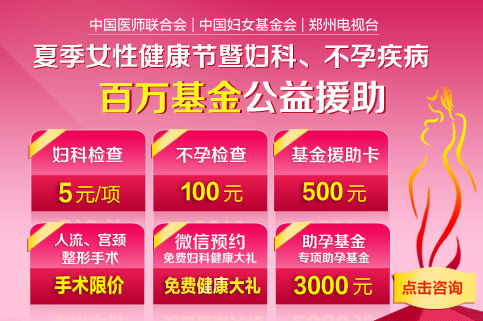 为了有效控制妇科疾病对女性生活健康带来的干扰,由中国医师联合会、中国妇女基金会、郑州电视台携手郑州新世纪女子医院举办的“夏季女性健康节暨妇科、不孕疾病百万基金公益援助活动...[详细]